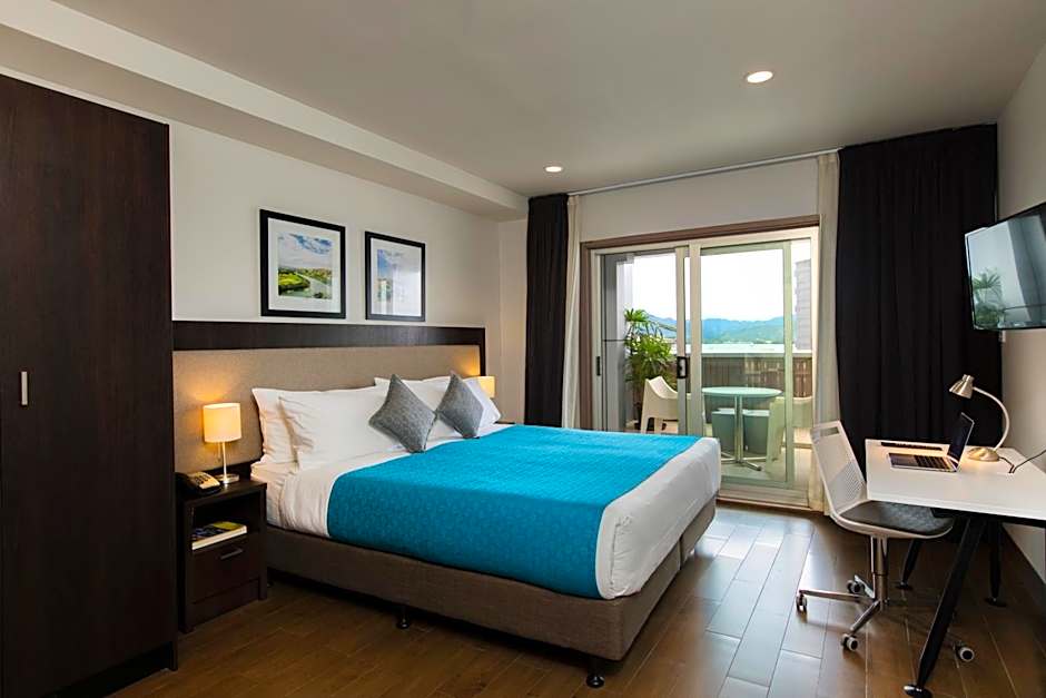 This renovated studio apartment features a fully equipped modern kitchen, a spacious balcony, work desk and a king-sized bed.